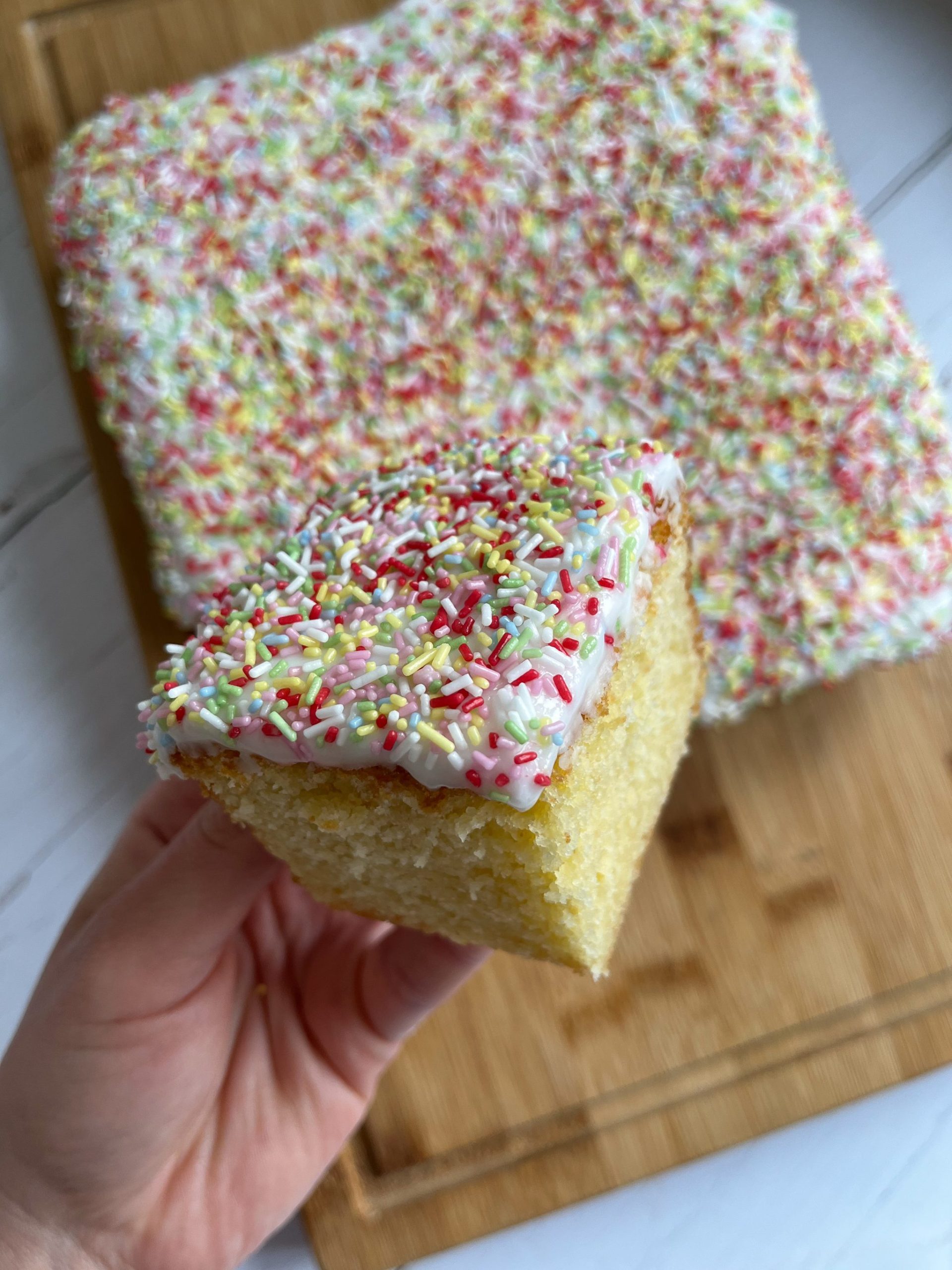 This classic old school sprinkle cake combines a vanilla sponge topped with icing and sprinkles. It takes me right back…